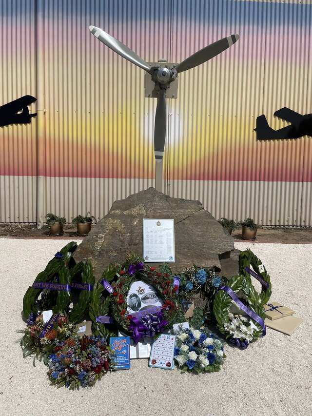 The new memorial at the South Australian Aviation Museum at Port Adelaide. The large wreath underneath the plaque shows pictures of FLTLT Ross Frayne who died in a crash at Mallala 70 years ago. (South Australian Aviation Museum)