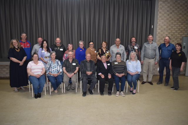 Everyone who gathered at Two Wells Community Centre for the 40th anniversary afternoon tea. (Back): Penny Pratt MP, David Paton (Adelaide Plains Council Deputy Mayor), Tony and Lisa Daniele, Peter Daniele, Kay Boon, Anne Arbon, Margherita Panella, Yolanda Cannizzaro, Robert Arbon, Mark Wasley (Adelaide Plains Council Mayor), John Dawkins, Richard Verner, Janene Lynne; (front): Robyn Ford, Christine Hayes, Mark Hayes, Joe Daniele, Denis Pellizzaro, Rae Corston and Lynette Seccafien. (Jarrad Delaney: 513126)