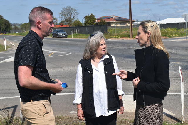 City of Playford Councillor Clint Marsh and Bronwyn Coulter from the Playford Growth Infrastructure Campaign speak with Sarah Game MLC on Dalkeith Road, at the Stebonheath Road intersection during a recent visit. (Jarrad Delaney: 506262)