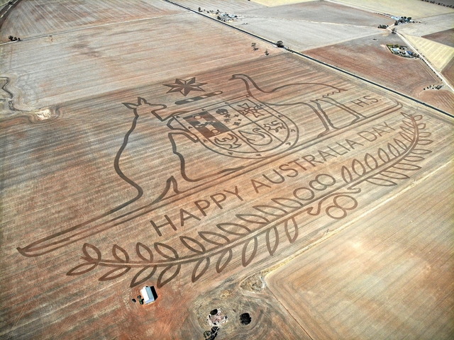 Harry Schuster's latest creation in his paddock at Freeling, a recreation of the Commonwealth Coat of Arms with a Happy Australia Day message. (Supplied)