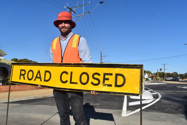 Wakefield Regional Council project coordinator William Dickson removes the road closed sign as the Edith Terrace/Short Terrace roundabout in Balaklava opens up again for traffic. (Jarrad Delaney: 485737)