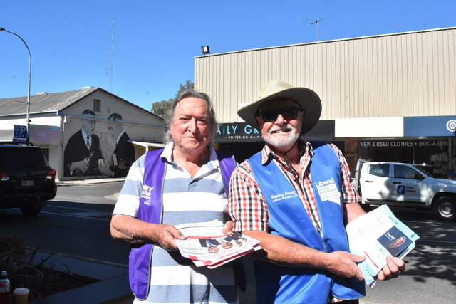 Volunteers Ian Stanley with the Liberal Party and Rob Royal with the Australian Labor Party demonstrate democracy standing together in Clare. (Kalli Batzavalis:542261)