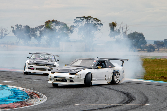 Couple Troy and Riki-Lee Lipschinski are recognised as the only husband and wife drift team in South Australia. Troy is pictured leading and Riki-Lee the chaser in a practice session on Saturday at Mallala. (Little Gem Photography)