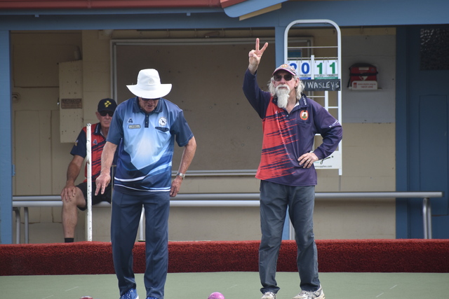 Wasleys skip Glen ‘Banger’ Harvey signals two-up next to Riverton skip Neil Rogers. (Jarrad Delaney: 517797)
