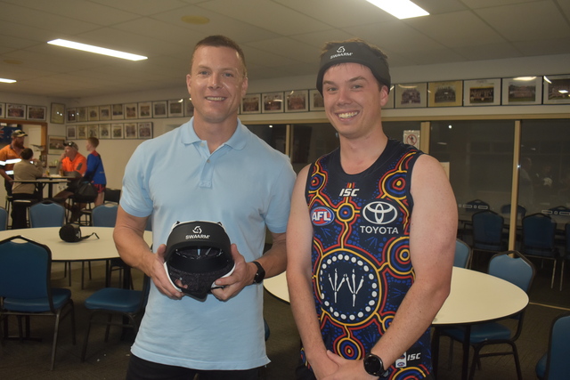 Former North Adelaide footballer Luke Ivens, representing SWAARM Global, with Mallala player and Under 14 coach Jack Evans, displaying different models of headgear. (Jarrad Delaney: 546484)